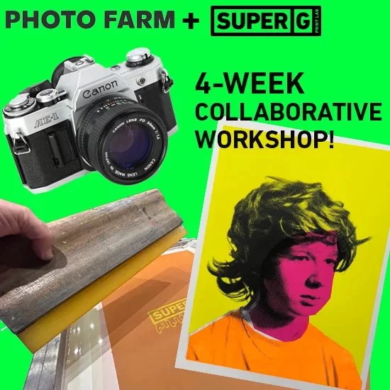 Over the span of 4-weeks, learn from start-to-finish how to make a photographic image and turn it into a screen print in the first ever PHOTO FARM and Super G Print Lab collab! Students will spend the first two sessions at PHOTO FARM learning the fundamentals of studio lighting and portraiture, followed by a short intro to Adobe Photoshop, with the goal of creating high key lighting for portraits which will then be turned into files that are maximized for Pop Art style screen prints (half-tones and masks).